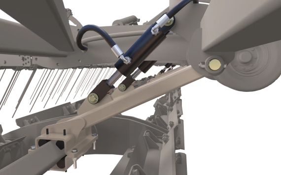 Каждая секция ножевых валов опирается на гидроцилиндры, сваянные с гидроаккумуляторами. В совокупности с креплением рамок ножей через резиновые демпферы создается 100% копирование рельефа.