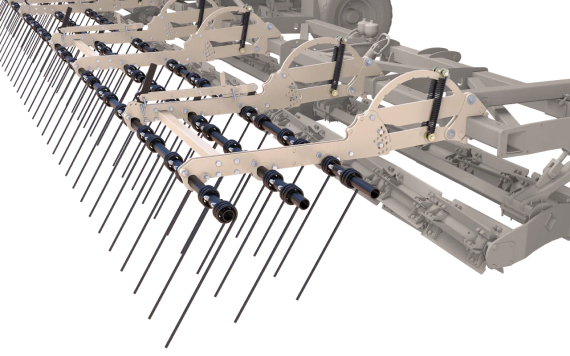 3-х рядная тяжелая штригельная секция равномерно распределяет измельченные растительные остатки. Предусмотрена регулировка угла атаки рабочих органов штригеля. Все три ряда секции закреплены на подпружиненном параллелограмном механизме.