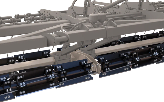 Каждая секция ножевых валов опирается на гидроцилиндры, сваянные с гидроаккумуляторами. В совокупности с креплением рамок ножей через резиновые демпферы создается 100% копирование рельефа.